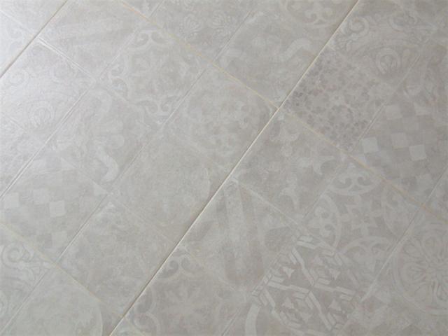 El suelo de la cocina es un porcelánico que imita los antiguos suelos hidráulicos. Combina blanco y gris, los colores predominantes de la cocina.