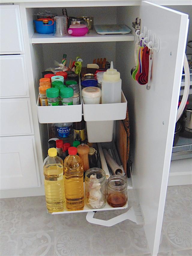 Además como veréis he añadido algún que otro extra a los interiores. Este es un organizador llamado Kitchen Tower. Caben todos mis tarros de especias, aceites, vinagres, y además tiene un cubo donde guardo los utensilios de madera. En un lateral puedo colocar las tablas de cortar. De lo más completo oiga. Y como me sobraba hueco pusimos un estante adicional donde guardo la báscula de cocina y las tazas medidoras. En el interior de la puerta he colgado las cucharas medidoras. Así lo tengo todo a mano.