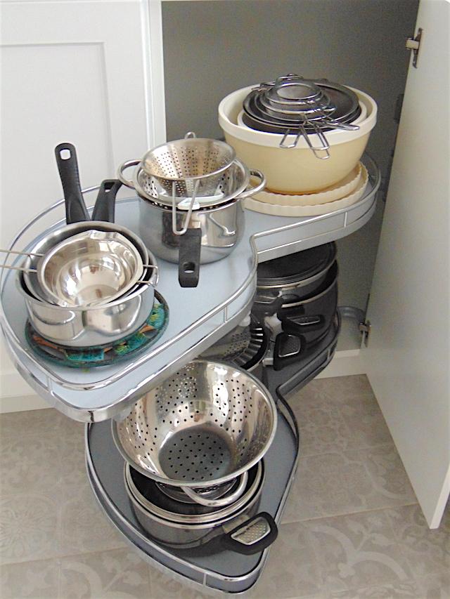 Para organizar el interior de un armario esquinero nada mejor que uno de esos cachivaches que facilitan la vida en la cocina.
