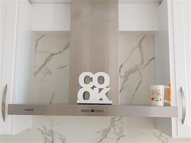La campana también en inox y decorativa. El cartel de COOK es, en realidad, un atril para tener más a mano los libros de cocina. La encimera de la cocina continúa como un panelado por el salpicadero. Así queda más práctica a la hora de limpiar, más decorativa e integrada. Ahora que la he probado os digo que es todo un acierto.
