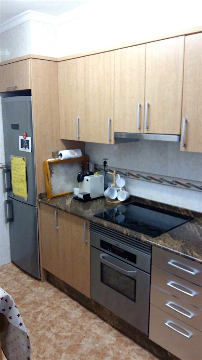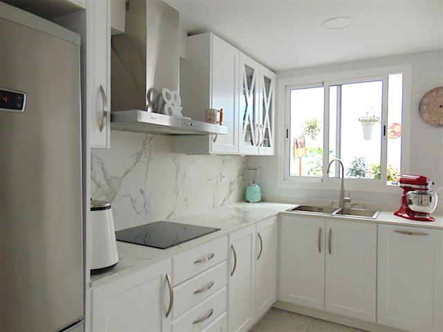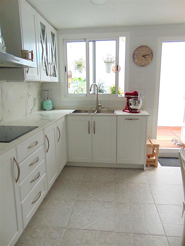 Esta es la tercera transformación de mi cocina desde que vivo en este piso y será la definitiva. Por circunstancias de la vida mi infancia y mi juventud me llevaron a cambiar muy a menudo de vivienda. Cuando hace 17 años compramos el piso, que se ha convertido en nuestro hogar, le dije a mi media naranja que no me iba a mover de él ni en sueños. No era perfecto pero tenía muchas posibilidades. La cocina era pequeña, las puertas de roble, rústicas. Con los años cambiamos esas puertas a otras de cerezo, lisas, sin molduras, más actuales, más fáciles de limpiar. Pero seguía sin ser la cocina que deseaba tener. Los cachivaches ya no me cabían en los armarios. Aún teniendo un patio o terraza en la cocina se me amontonaban las cosas por falta de espacio. Además no era muy cómodo comer en una cocina pequeña, plegar y desplegar la mesa en un reducido espacio. Siempre me han gustado las cocinas grandes, tipo americanas, donde hacer vida. Y siempre me han gustado luminosas, blancas, nórdicas. La idea estaba ahí rondando en mi cabeza durante años hasta que mi marido me siguió en otra de mis ideas delirantes y el sueño se hizo realidad.