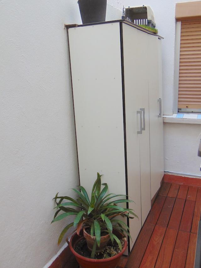 La suerte de vivir en un primer piso es que tenemos dos terrazas, una en nuestro dormitorio, más de disfrute, y otra en la cocina. Es un desahogo poder guardar todos los productos de limpieza, cubos, escobas, fregonas, carro de la compra, lava-secadora, calentador, … , hasta mi gato Lenny tiene sus cosas en la terraza. Esta vez además pensamos en lavar un poco la cara de la terraza colocando tablillas de madera tropical de ipe y renovando y trasplantando mis plantas a grandes maceteros. El resultado me encanta.