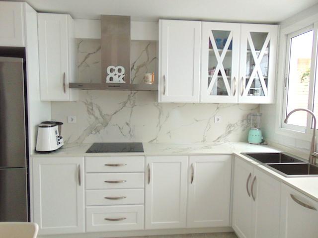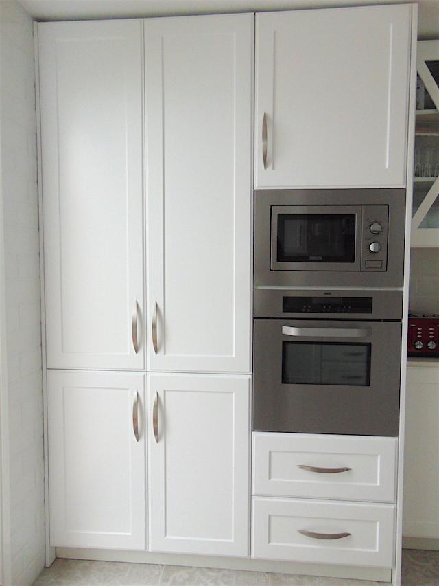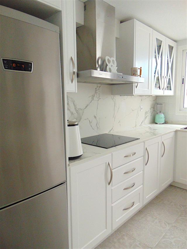 El mobiliario es en DM blanco lacado, el modelo de puerta se llama Málaga. Optamos por poner tiradores en cromado para seguir la línea de los electrodomésticos todos visibles menos el lavavajillas que va panelado.