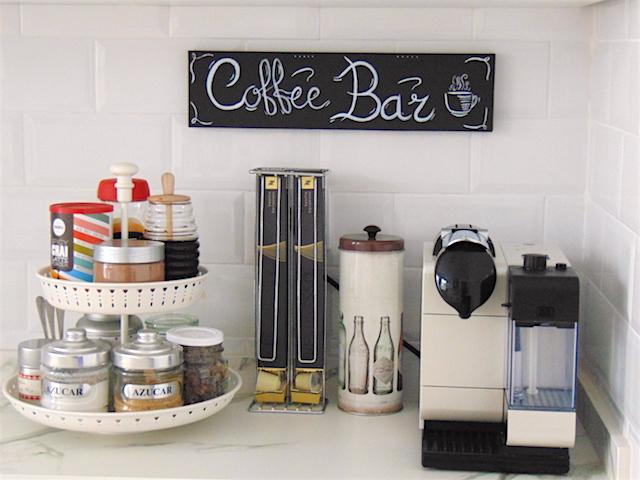 Había visto esos bonitos rincones del café en Pinterest y tenía ganas de hacer uno en casa, todo a mano, sólo necesito coger la leche para el café.