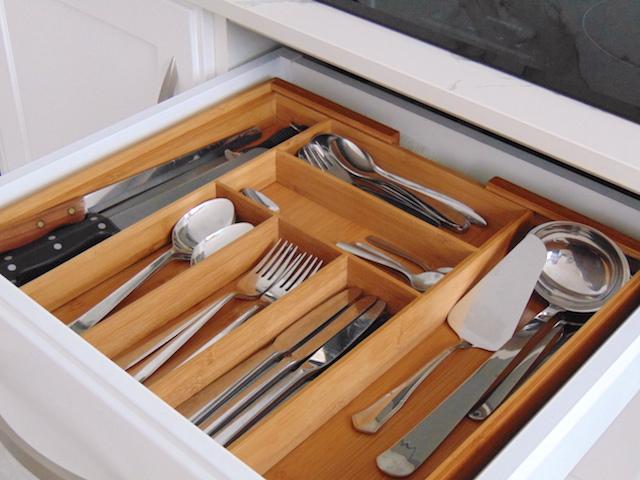 Los cuberteros son de madera de bambú y extensibles. Todo organizado en 3 grandes cajones Hettich que se deslizan solos.