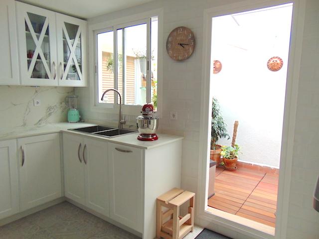 Como veis tener la terraza a continuación da más sensación de amplitud. Las cocinas con poca luz ganan mucho si eliges mobiliario y azulejos blancos con brillo.