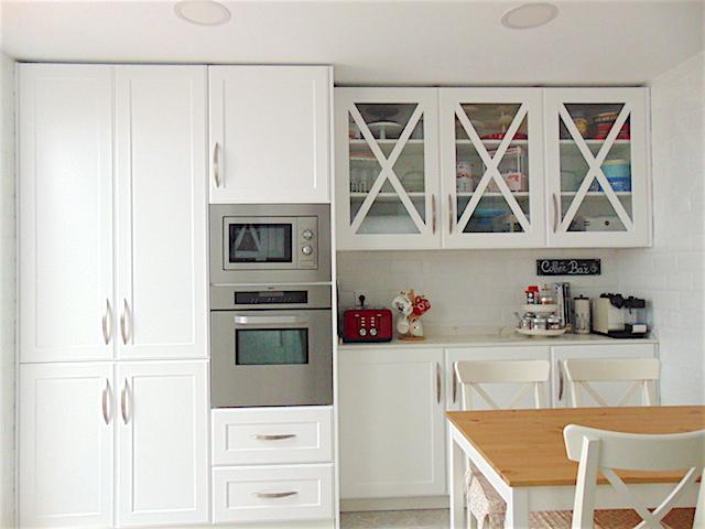 Lo que más nos costó es decidir cómo meter una pantalla negra en una cocina tan blanca, no sabía como encajarla. ¿Dónde podíamos poner la T.V. sin que desentonara y que pudiéramos verla todos al mismo tiempo? ¿En la encimera? ¿Empotrada en un mueble? ¿En columna junto al horno y microondas? No, no me acababa de convencer.