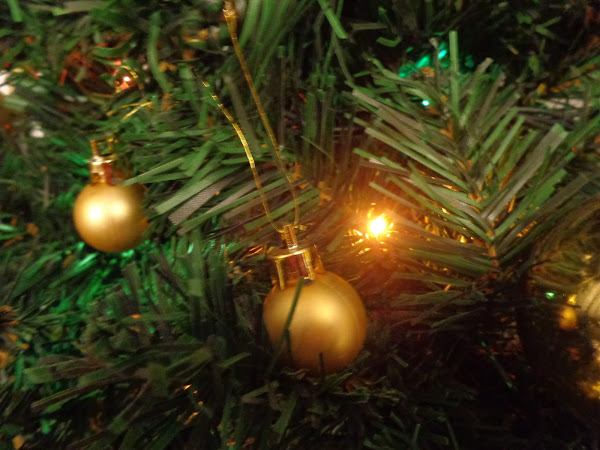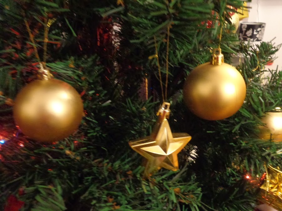 El arbolito está decorado a base de bolas, estrellas, regalitos y chupones de hielo en tonos dorados, (excepto una pareja de noeles y alguna campanita en rojo).