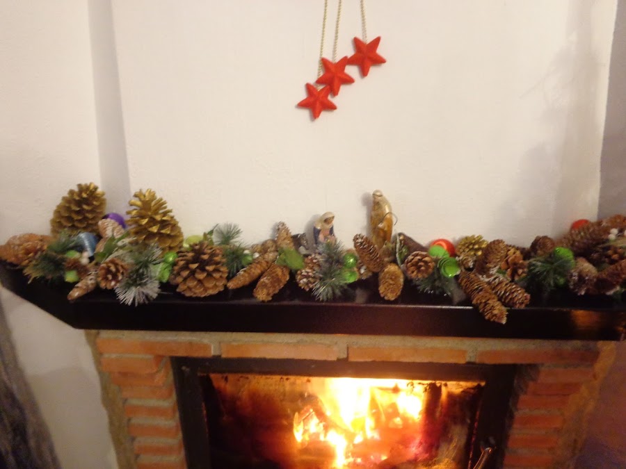 Sobre la chimenea he colocado una guirnalda de piñas y un pequeño nacimiento.