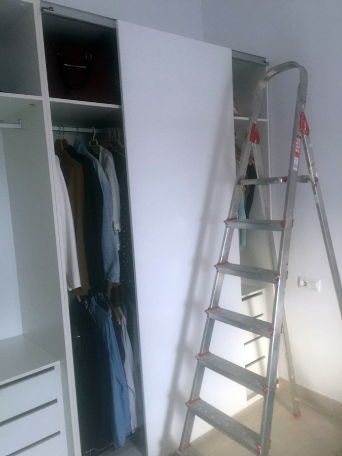 Preparamos el espacio desalojando el antiguo armario y haciendo espacio en el dormitorio para montar los interiores apoyados en el suelo así no nos costará tanto esfuerzo y quedará perfecto.