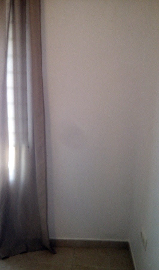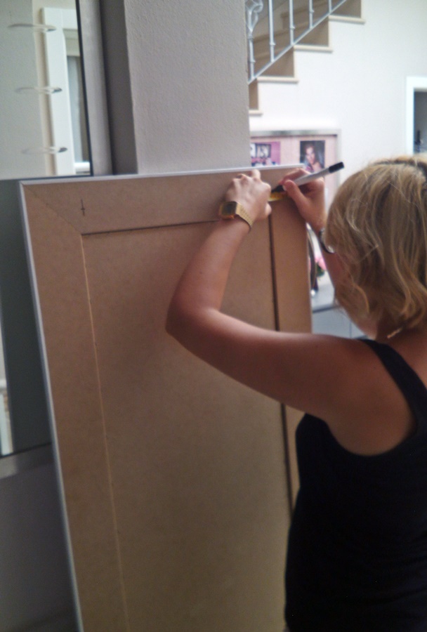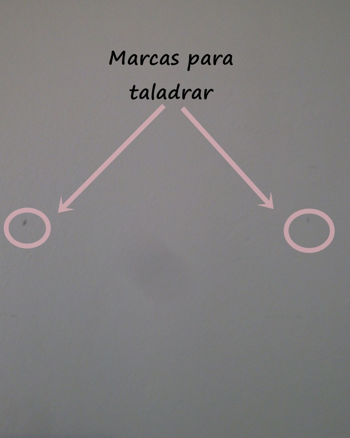 2º Una vez colocados los cáncamos en el espejo nos vamos a la pared donde lo vamos a colocar para marcar los puntos a taladrar.