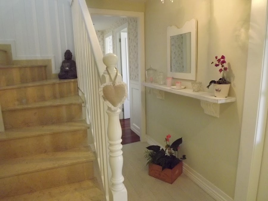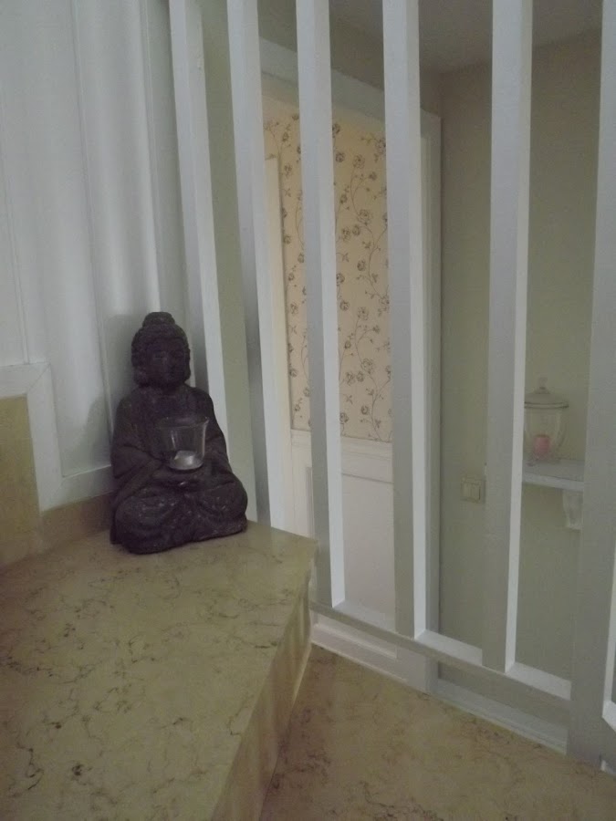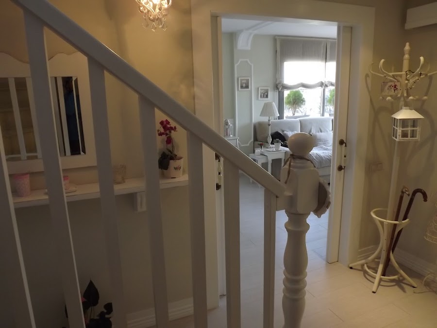 Esta ha sufrido un gran cambio...en un principio era totalmente moderna,de cristal, pero no nos gustaba así que mi marido la reconstruyó entera, de madera blanca,que le da ese aire antiguo que tanto nos gusta...Le pusimos un arrimadero de lamas blancas y por encima nuestras fotos de todos nuestros viajes que no son pocos...