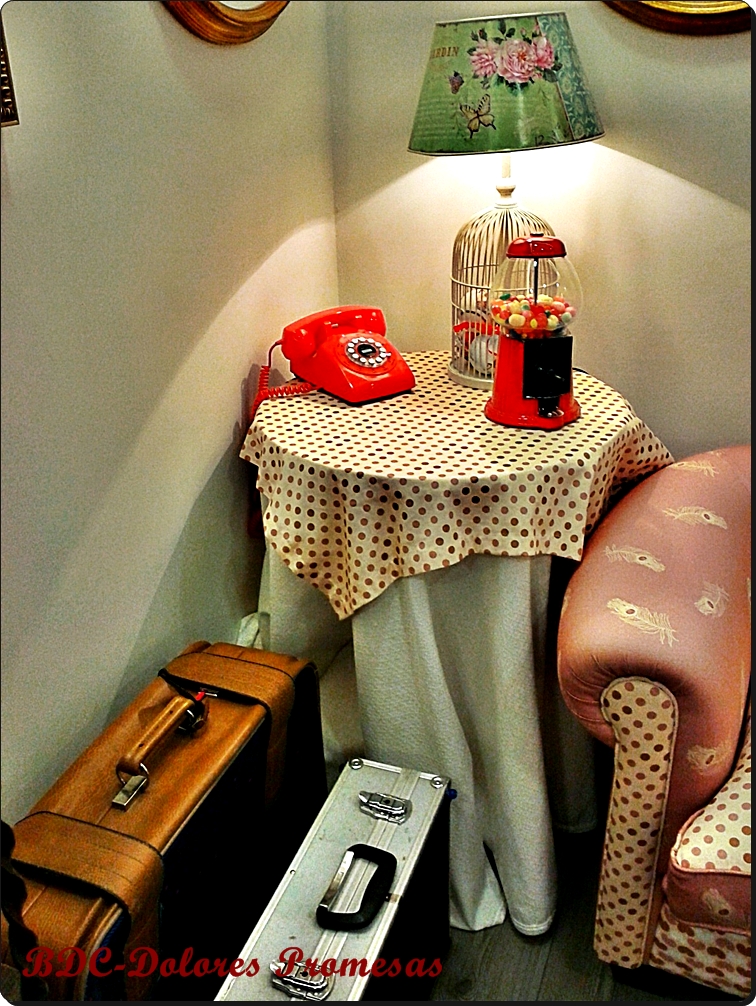 Este rincón me encantó, teléfono retro con una sencilla mesa camilla y las maletas vintage