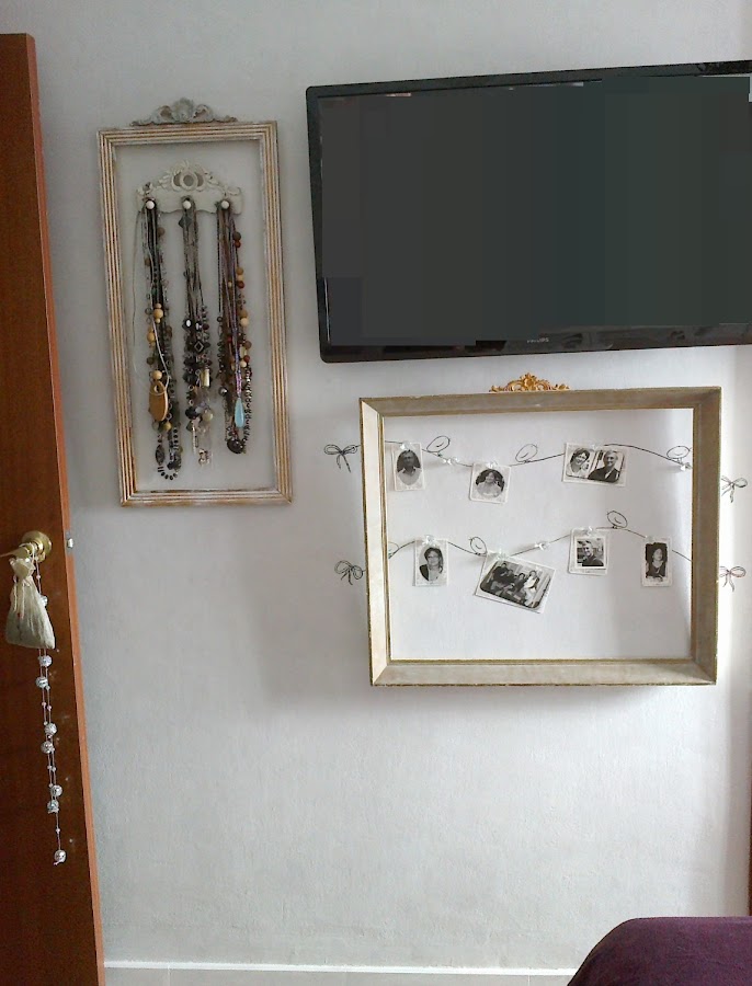 Esta es la muestra de que unos marcos bonitos pueden destacar cualquier diseño y no sólo enmarcar una pintura. Un colgador para collares y un expositor de fotos.