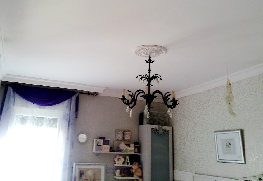 Destacar esta lámpara del siglo pasado encontrada en un rastrillo en Barcelona, está restaurada, antes era color bronce. Le hemos añadido un rosetón de resina, que no pesa tanto como el de escayola.