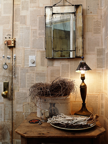 La originalidad de este , es que la pared esta forrada con hojas papel de diarios y libros y su decoración esta compuesta con ramas y objetos vintage ... Es muy original....