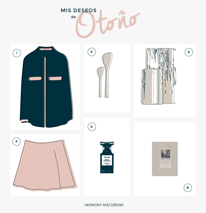 Hoy comparto mi lista de deseos de Otoño, ya ha llegado aunque yo todavía no lo he notado, por eso quizás sigo teniendo tendencia a colores más veraniegos. Me apetece, bueno realmente, lo podría definir como, casi mi uniforme, una falda corta y con bastante vuelo y camisas me rechiflan y entre más masculinas mejor, normalmente siempre blancas pero me apetecía esta azul marino de ZARA al igual que la falda. Gracias a Maia de EL TOCADOR DE DOROTHY, he descubierto esta colonia de Neroli, todavía no la tengo y le tengo muchas ganas. Otro de mis deseos es el libro de SUNDAY SUPPERS, creo que debe ser una joya de textos y fotografías. Por último, no podía dejar de lado, los accesorios para la cocina, en este caso, necesito las cucharas de madera, me enamoran las de bebé de la tienda de Vero, LE SHOP y las tablas de la tienda que compartí la semana pasada. Creo que por ahora basta de desear hasta la próxima lista. Qué deseas tú para este Otoño?
