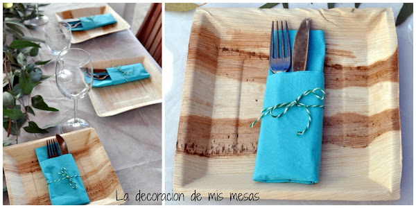5º Por ultimo, con unas servilletas de papel turquesa hice unos bolsillos para los cubiertos y los até con un poco de baker"s twine. Sobre los platos de palmera quedó precioso.