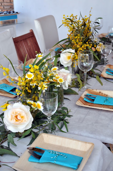 Con todo ello, hice un precioso camino de mesa vegetal que iba de punta a punta de la mesa. Para tanta abundancia de flores (ya sabéis que no tengo jarrones) utilicé los botes de cristal y latas que siempre guardo para estas ocasiones.