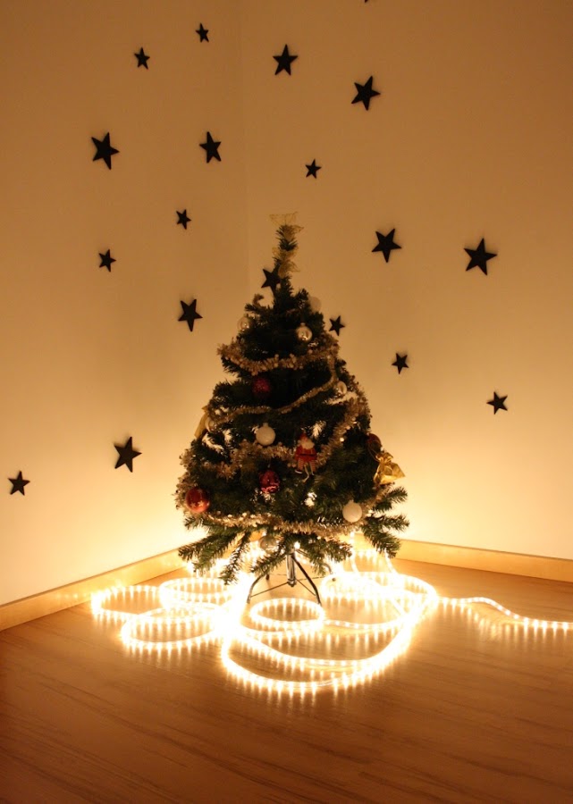 Me gustan los detalles navideños pero no me gusta recargar la casa de espumillones y demás. Asi que hemos centrado toda la atención navideña en un rincón de mi pasillo-recibidor con una linea de luz que empieza en la puerta de entrada de la casa y conduce hasta... nuestro ARBOL DE NAVIDAD!!!