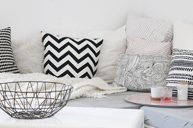 Se trata de un rincón con un bajo techo podría ser el típico rincón debajo de la escalera, buhardilla o similar, la combinación en blanco negro me ha encantado pero con un cojín en gris clarito como es este caso se pueden hacer cualquier mezcla de cojines que os podáis imaginar.