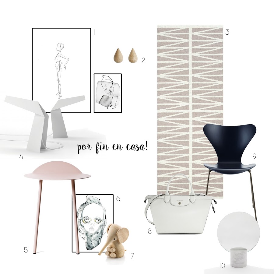1. Láminas de Gaia Padovan / 2. Percheros gota de Normann Copenhagen / 3. Alfombra de vinilo trenzado de Brita Sweden modelo Helmi / 4. Lámpara de Obvious / 5. Mesa auxiliar de Menu / 6. Lámina de Gaia Padovan / 7. Elefante de madera de Lucie Kaas / 8. Bolso Longchamp / 9. Silla Serie 7 de Arne Jacobsen / 10. Espejo con base de mármol de Aparentment