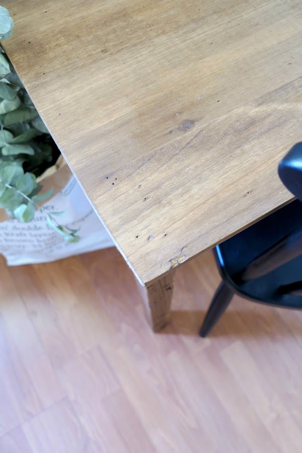 Paso 4. Envejecer la mesa. Para esto vamos a utilizar cualquier objeto que la pueda dañar. Yo quería que pareciera una mesa antigua por lo que no quería que fuera perfecta y estuviese muy dañada por el tiempo. Así que un día que estéis mal esta técnica es perfecto para desfogarse. Golpear con un martillo, un cortafríos, con un trapo llenos de tornillos…Golpear la mesa por todos los lados sin ninguna piedad, hasta que este a tu gusto. Para enfatizar este paso de tiempo podéis hacer con un martillo un clavo pequeños agujeros para disimular la carcoma. Últimamente me ha dado por hacer esta técnica.