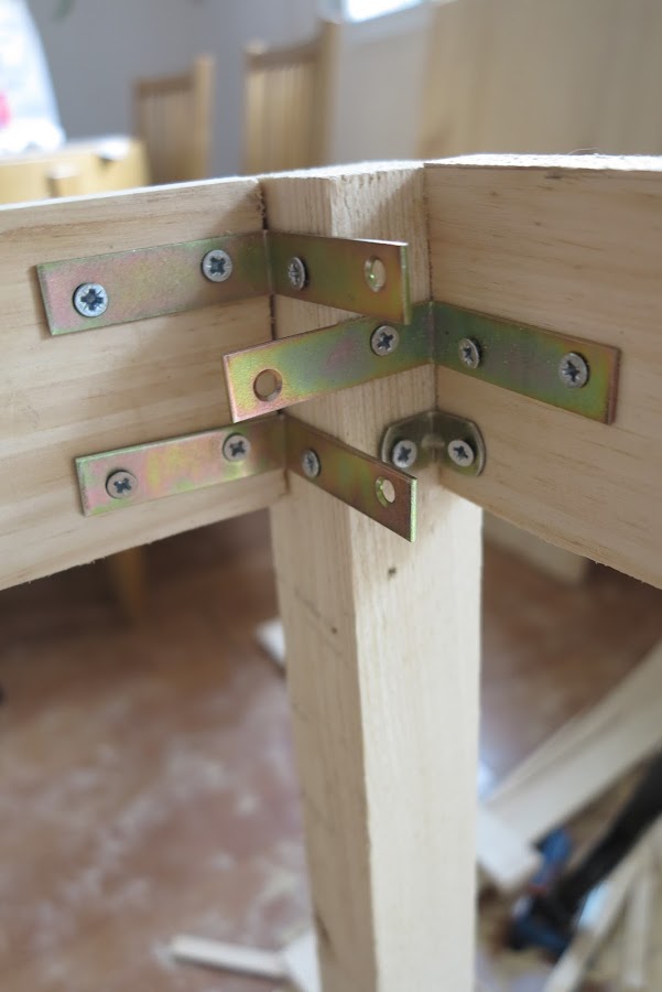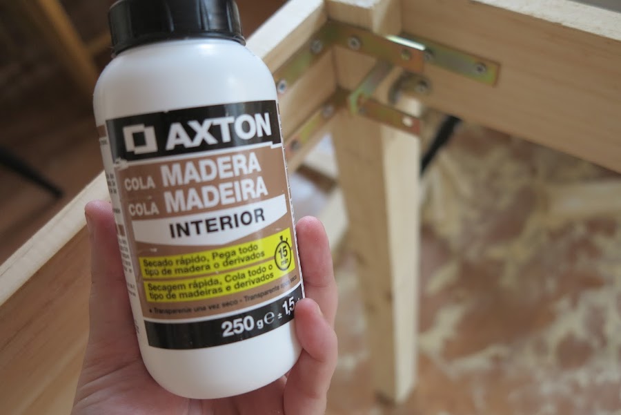 Paso 2. Una vez todo cortado, esto ya sabéis con mucho mimo y mucha paciencia (cosa que me falta jajaja) Vamos a montar toda la estructura y unir todas las uniones con cola para madera y reforzando con unos ángulos metálicos. Nota: Fijaros en el tamaño del ángulo y la pata, yo no me fije solo busque el de mayor grosor y se me quedo con un sobrante (esto se puede cortar pero yo por pereza y querer terminar ya no lo hice aunque no se ve, quedaría más estético)