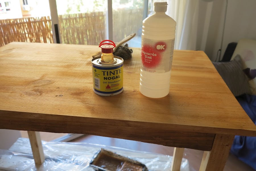 Paso 5. Añadir color. Podéis utilizar un tinte para madera o cualquier tipo o color de pintura. Esto según vuestro gusto y como queráis la mesa. Yo quería que tuviese un punto de madera nogal, así que use un tinte disolviéndolo con aguarrás para que no quedase muy fuerte. Las medidas fueron un poco a ojo pero si tire más aguarrás que tinte.