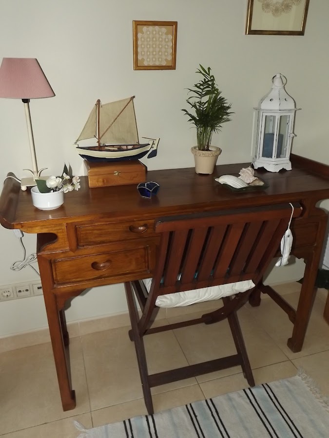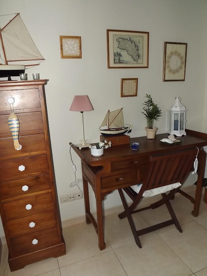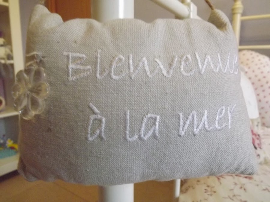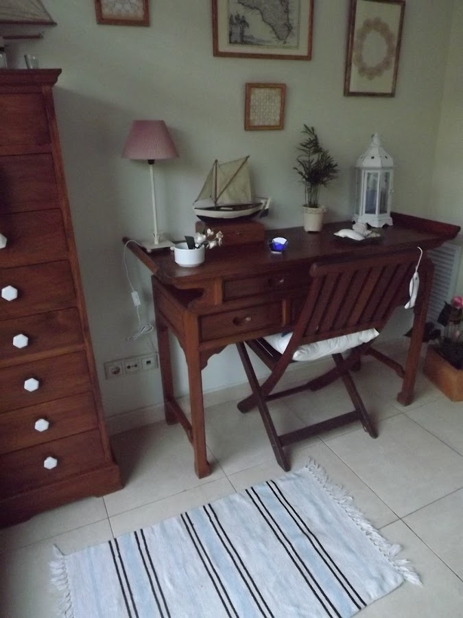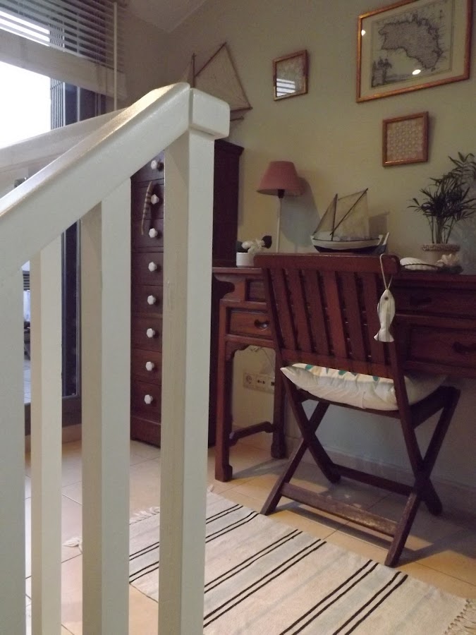"Bienvenido al mar" dice el cojín colgado en el alzapaño al subir las escaleras de la planta de arriba,tiene un encanto un tanto especial y diferente al resto de la casa,muebles oscuros,barcos,conchas recogidas en nuestros viajes,peces de tela,faroles con velas azules... sus vistas a la terraza hacen de él el rincón preferido de todos.