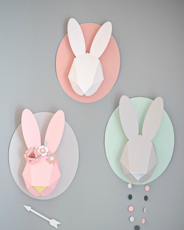Empezamos con unos adornos de cartón con la forma de cabezas de conejitos que puedes crear con la técnica de origami. Para realizarlas tan solo tienes que descargar la plantilla que encontrarás en este post diy máscaras decorativas de cartón. Elige unas cartulinas de un color dulce e imprime, recorta, dobla y pega.
