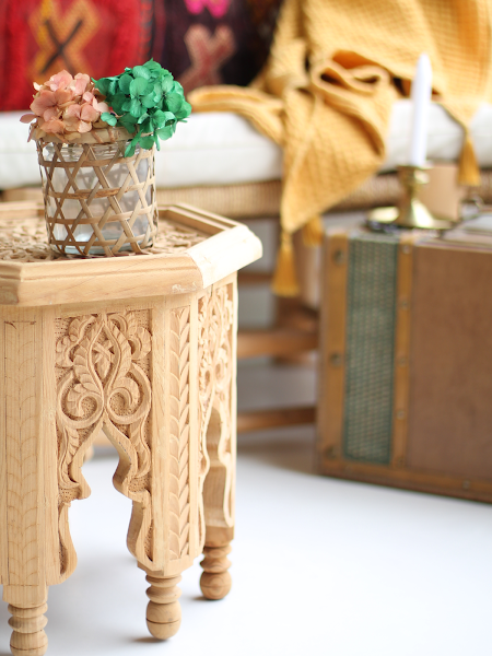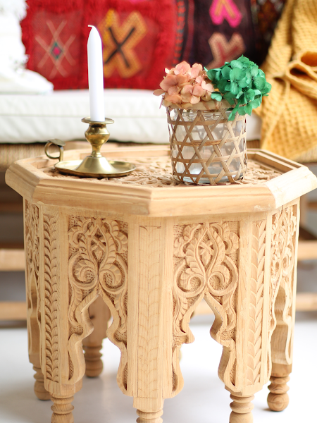 Buenos días! Esta semana teníamos pendiente un nuevo #Retointeriorismo en el que os enseñamos nuestro rincón vintage. Aunque en casa no tenemos demasiadas piezas de este estilo, queríamos hacer una composición marroquí-vintage para mostrar que en el estilo marroquí también hay piezas antiguas que pueden dar mucho carácter a una estancia. En este caso, hemos redecorado nuestra pequeña terraza. Al introducir una mesa de centro, el espacio se ha multiplicado y hemos ganado en comodidad. Muchos preguntábais por la mesa, se trata de una pieza hecha a mano por un pequeño artesano en Marruecos, y además ya la tenéis disponible en la Shop. Varios cojines handira con lentejuelas (un básico que nunca debe faltar) y algunos portavelas de madera y latón que siempre aportan ese toque rústico que tanto nos gusta.