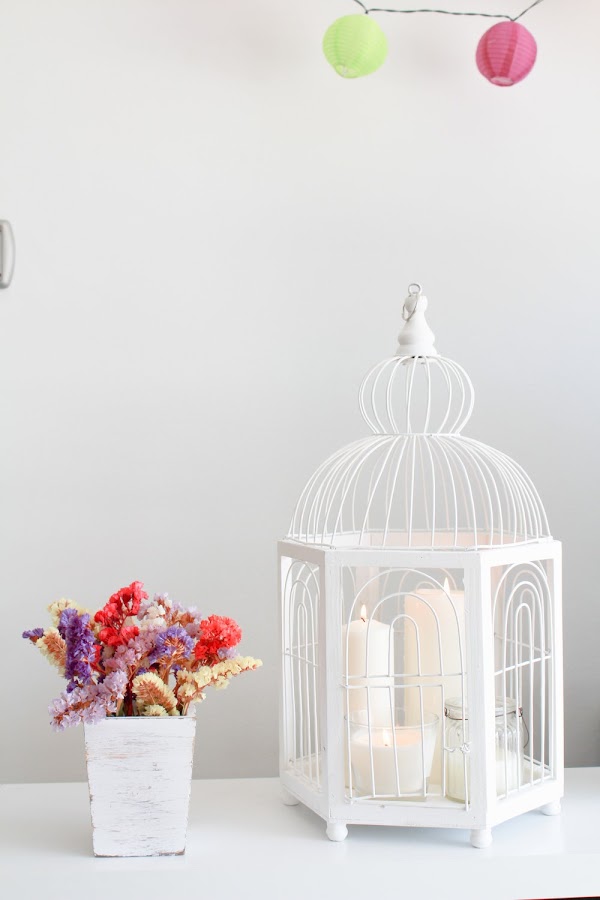 El resto de la decoración ya la habíais visto, las laminas felices de Happy Ideas se han convertido en un clásico, pongas lo que pongas siempre quedan bien, para vestir el banco y darle un toque mas acogedor añadí la jaula llena de velas blancas así no lo recargaba y encendidas hace un efecto precioso.
