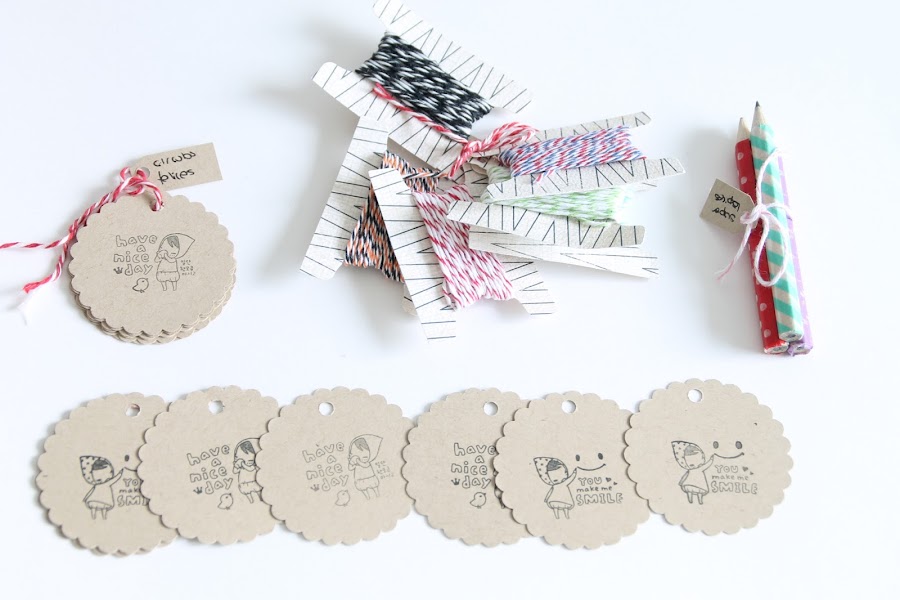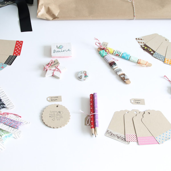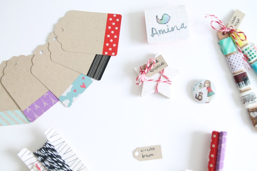 Dentro un precioso kit con todo lo necesario para envolver regalos y más regalos: Washi tape liadito en unos palitos de madera, tarjetitas decoradas, lápices, estrellitas, pinzas, flores para adornar, unas cuerdas preciosas en todos los colores imaginables, chapitas y lo qué más ilusión me hizo , un sello hecho por ella misma con la firma de Amina.