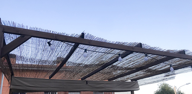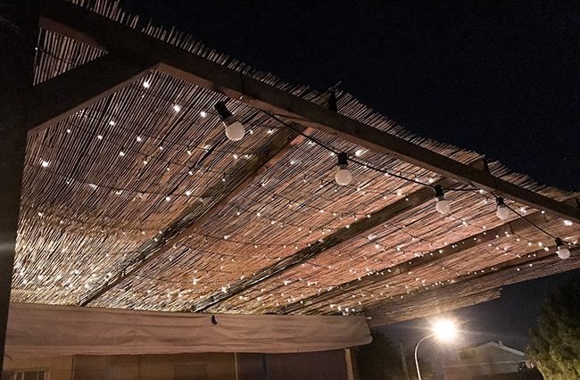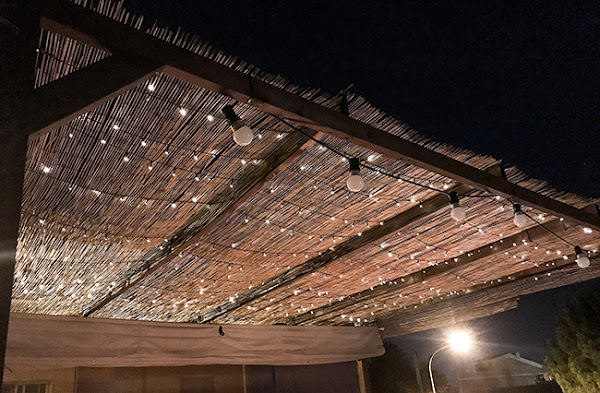 De hecho, para que veáis bien lo bonita que es he hecho unas fotos tanto de día como de noche. ¿Habéis visto la iluminación? Es muy sencillo, solo se necesitan algunas guirnaldas led (aquí os dejo el enlace) y un poco de paciencia para irlas enrollando en cada palo de la pérgola.