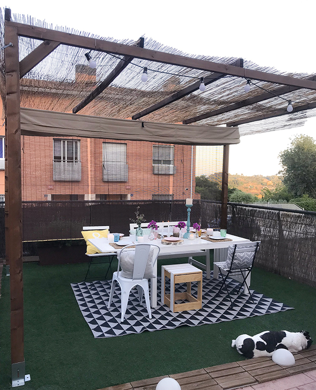 Así que he puesto mucho mimo en esta zona. Gracias a nuestros amigos de Leroy Merlin conseguimos la pérgola perfecta (se trata del modelo Navia con toldo de 3x4). Da sombra, es fácil de montar (os puse vídeos en mi cuenta de Instagram) y al ser de madera crea un efecto muy acogedor. Con el cañizo tienes una alternativa más económica y una sombra perfecta.