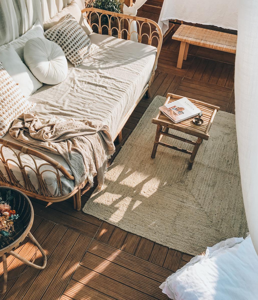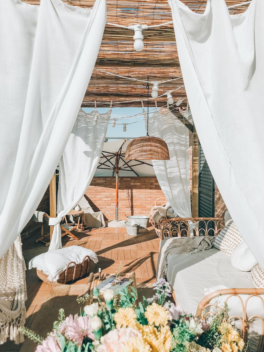 A continuación, colocamos la cortina de lino tapando las marquesinas y la segunda camá/sofá de mimbre de La Redoute que, junto con la mayoría de muebles, se trasladarán a la buhardilla durante los meses de otoño/verano.