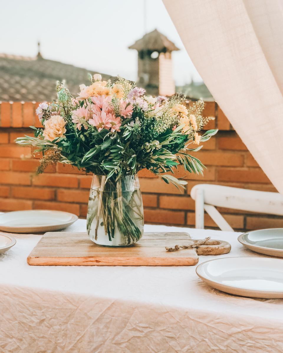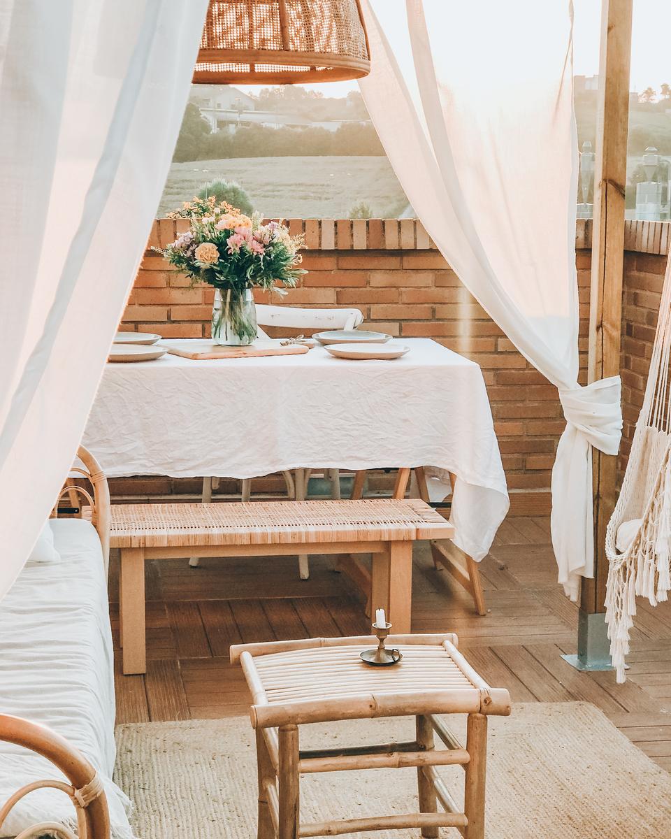La zona de “cenador” fue la siguiente a decorar. Utilicé el tablero y caballetes de Astideco que, por cierto, acaban de estrenar tienda online, y un mantel de lino de Zara Home. La vajilla es de Westwing, la tabla de cortar rústica de Muy Mucho y las flores de Colvin (código descuento MUMANDHOME)