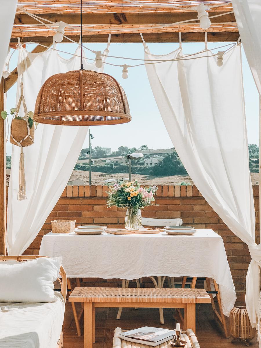 El sofá de mimbre que compré hace unos meses en Wallapop y, por último, añadimos esta guirnalda de luces de color blanco y totalmente personalizada de Dekoark a la pérgola.