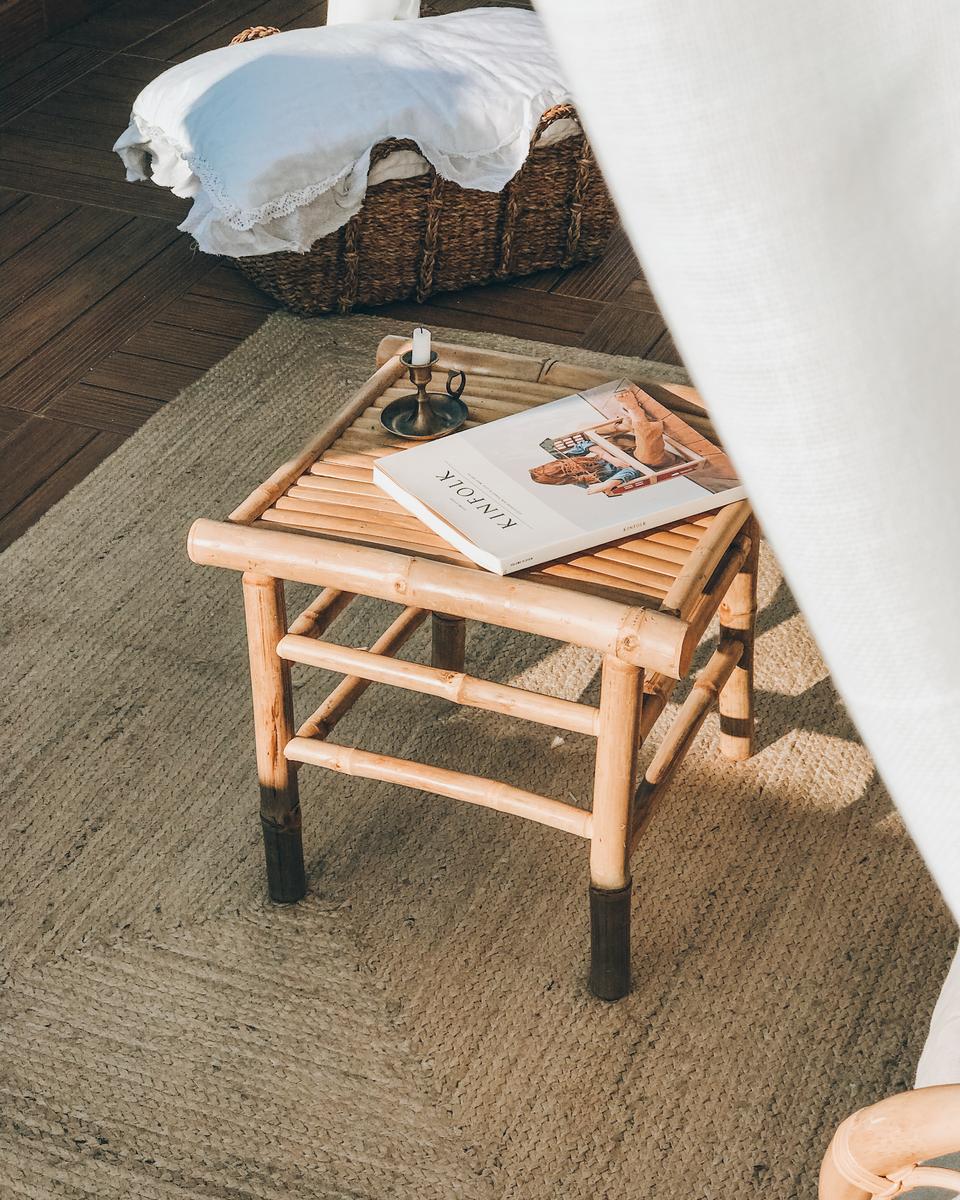 Colocamos la lámpara y la mesita auxiliar de fibras naturales de Minetuhogar, la alfombra de yute que teníamos en la buhardilla, y la mesita de bambú de Westwing.