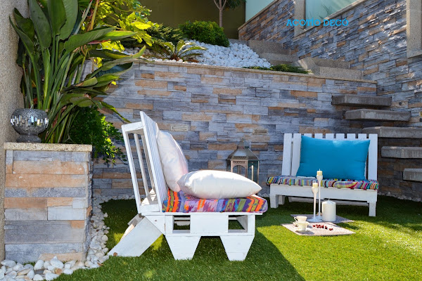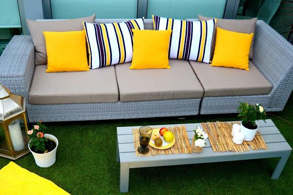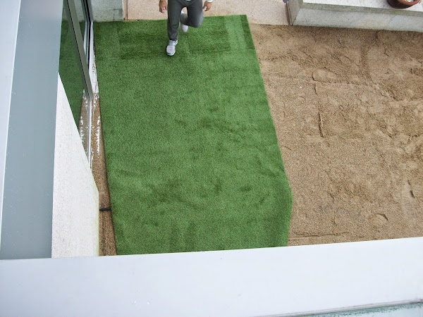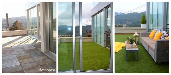 El caso es que en primavera y verano lo disfrutamos tanto, que queríamos ampliar el jardín, pero no teníamos metros disponibles. Aprovechando la reforma de la cocina (que todavía tengo pendiente enseñaros) ampliamos y "plantamos" nuestro césped artificial en la terraza contigua al pequeño jardín ya existente y a la cocina. La colocación del césped artificial es muy sencilla, y aunque también requiere unos cuidados básicos no es tan complejo como la hierba natural (corta cesped, abona, quita malas hierbas...etc). Basta con regar de vez en cuando y sacar las hierbas que nacen por las esquinas.