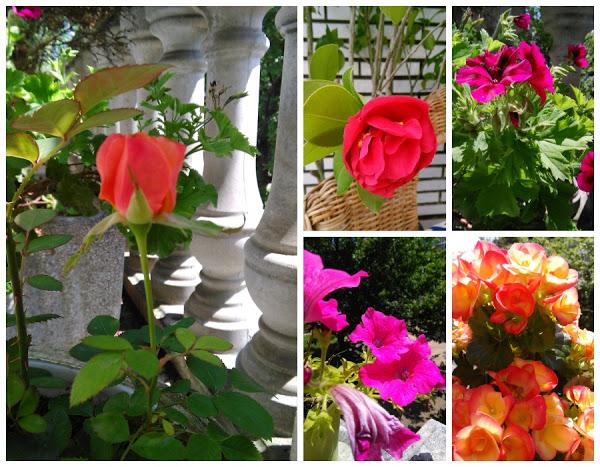 Otro de los alicientes que tiene esta terraza son las plantas y flores que la rodean; pequeños pinos y abetos, palmeras enanas, mandarinos y bojs aportan el verde, y el color las flores de las bugambillas, camelios y adelfas. Además me gusta introducir plantas de temporada, por ejemplo ahora en verano begonias, azaleas, surfinias, rosales, geranios.......aportan color y alegría.