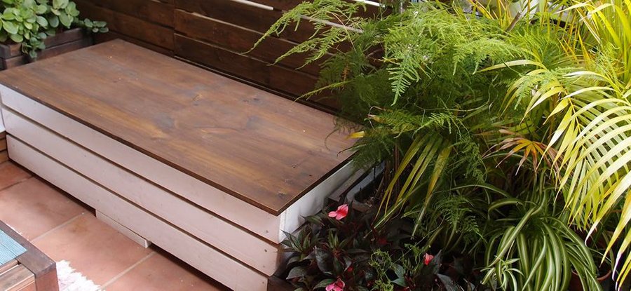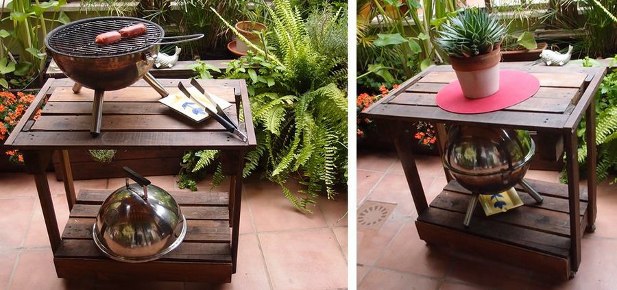 Para ello creamos un banco-arcón, pintamos un armario de resina que ya teníamos imitando madera, y construimos un carrito auxiliar con madera de palets para tener nuestra mini barbacoa.El proceso de todo eso lo puedes ver si te interesa en 3 ideas de almacenaje para la terraza