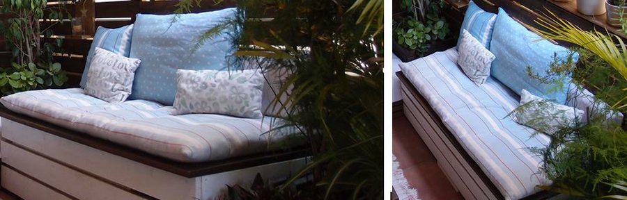 Y cuando por fin teníamos el almacenaje solucionado pasamos al punto de crear una zona de relax, para poder sentarnos y que nos diera el fresquito por las noches. Para ellos lo que hicimos fue echar mano de los socorridos palets, Forramos la pared con un zócalo de machihembrado, y pusimos muchos cojines. Todo el proceso está explicado en la terraza chill out, ahí podéis ver el antes y los pasos que seguimos para llegar a buen termino. Y aquí teneis el resultado de tanto trabajo.