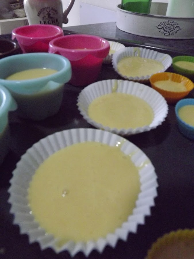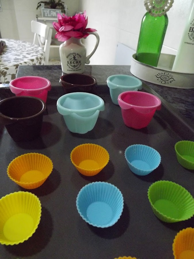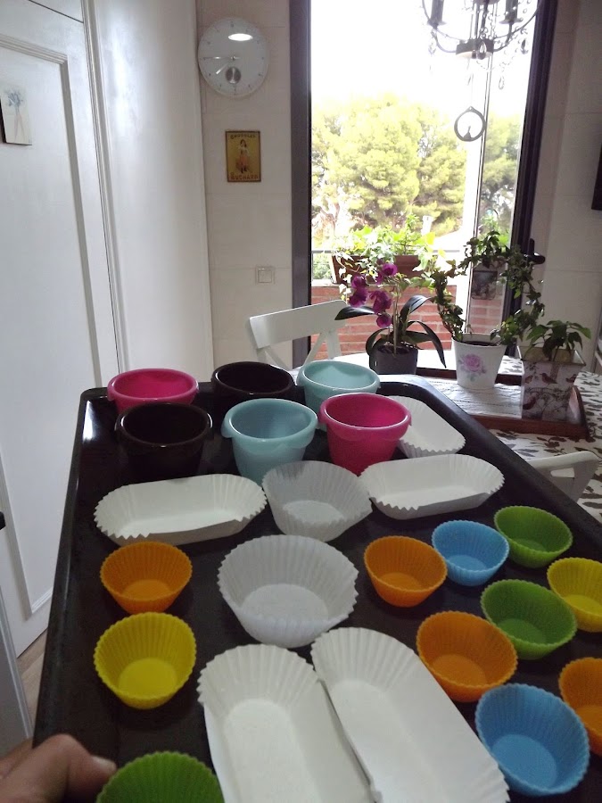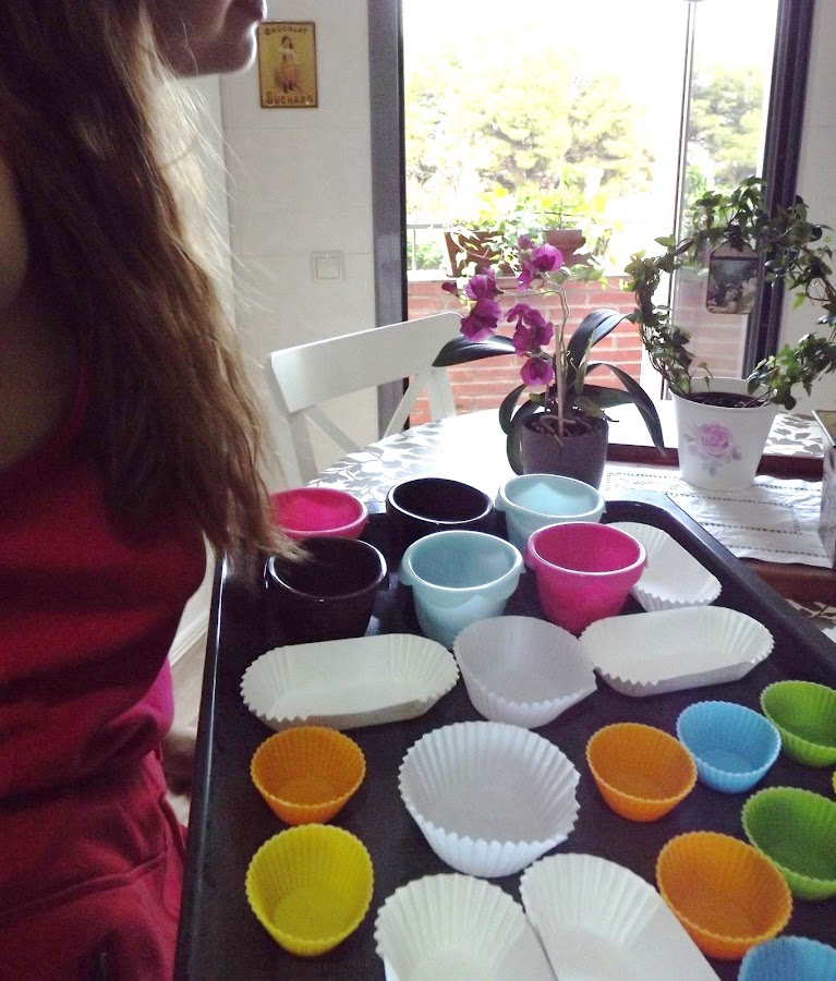 Esparzo mis moldes de silicona en multitud de colores, los hay pequeños redonditos y más grandes y hondos. También, como se que me saldrán muchas magdalenas, cojo los que son de sencillo papel en blanco. Éstos dan a las magdalenas un aspecto mucho más natural una vez elaboradas, sin embargo los de silicona son prácticos y puedo volver a utilizarlos siempre que quiera...