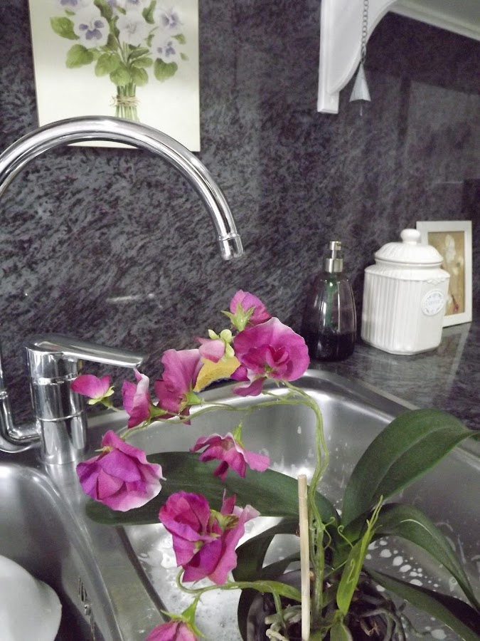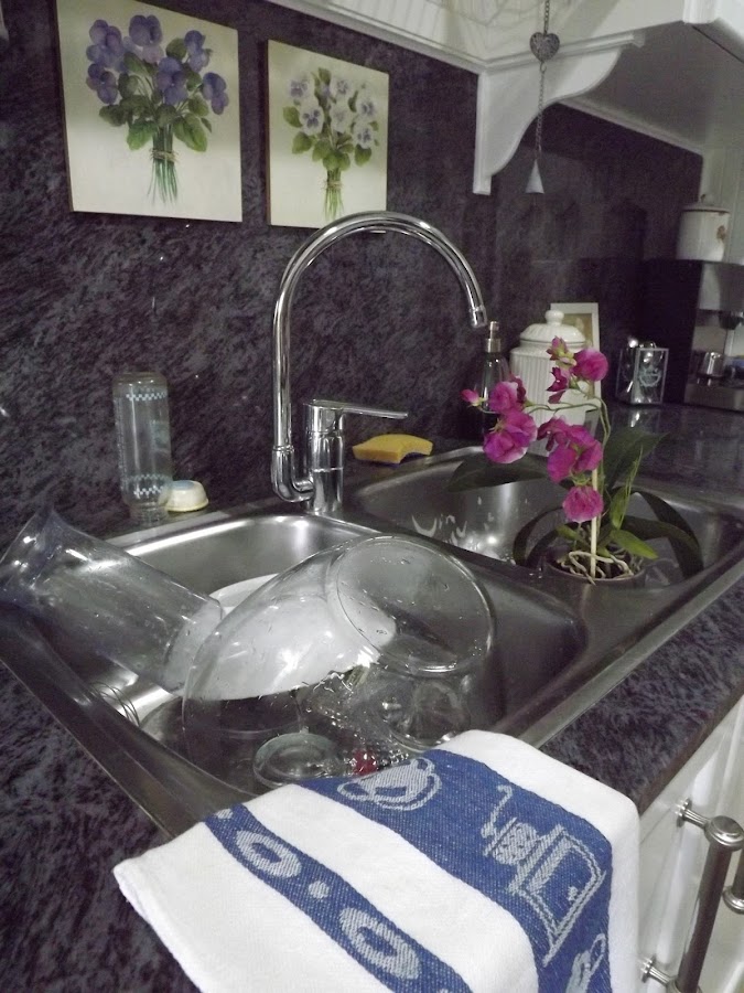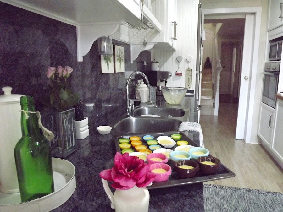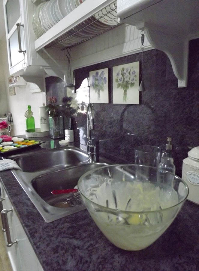 Y aquí mi cocina algo revuelta, platos aquí y allí. Es lo que tiene cocinar y repostear que después no nos queda otra que lavar y recoger todo lo utilizado...