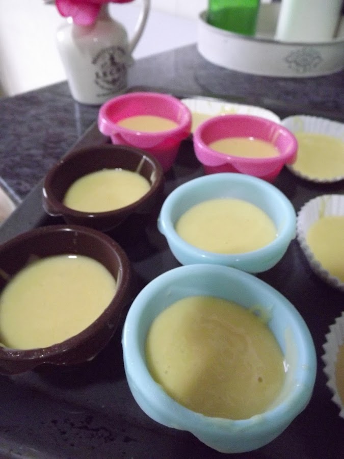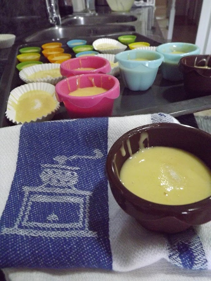 Realizada la masa, la vierto con paciencia dentro de cada uno de los moldes...