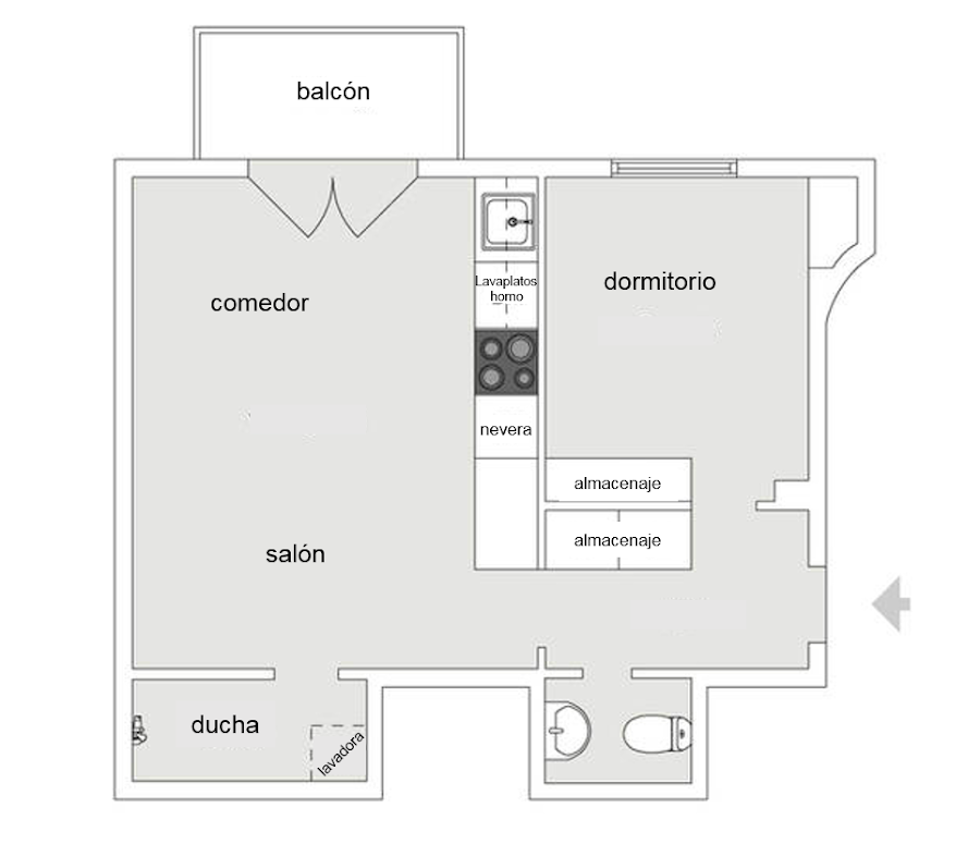 Una distribución básica, cocina y salón en un solo espacio, quedando el dormitorio y el vestidor a parte y que permite tener hasta un hall de acceso a la vivienda. También se ha separado la zona de ducha del inodoro y el lavabo. Un apartamento que invita al descanso mediante soluciones simples que transmiten confort.