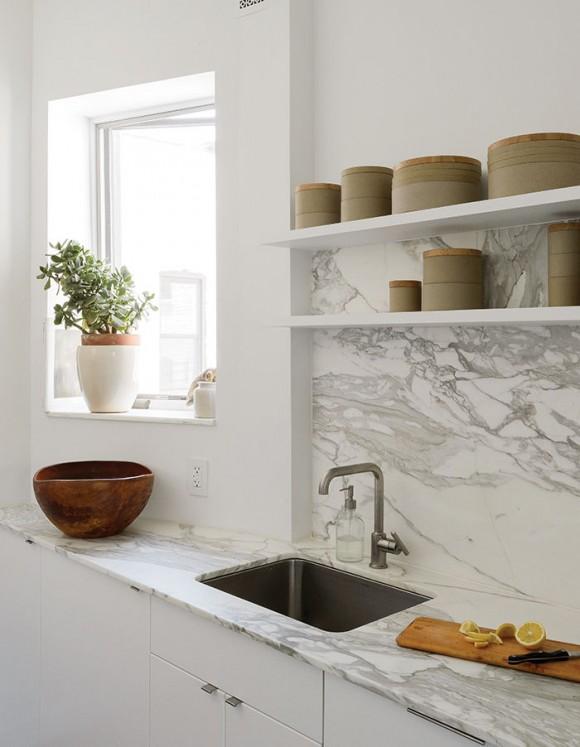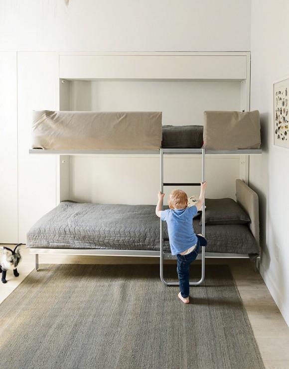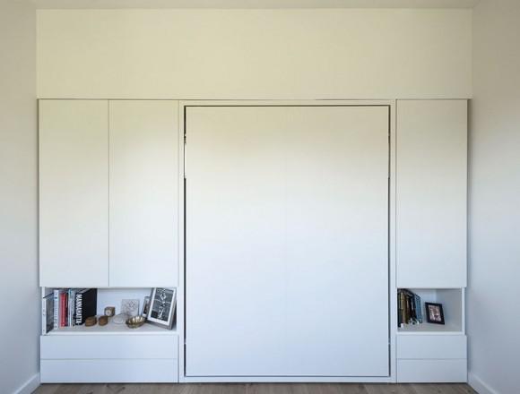 Y así lo hicieron, aprovechando todos los recursos para ahorrar espacio: puertas correderas, camas que se esconden en la pared, cocina abierta al salón, armario en el pasillo para ganar espacio de almacenamiento, un gran espejo que da sensación de ampliar el espacio y multiplica la luz natural... Y todo ello haciendo uso de buenos materiales para dar cierta sensación de lujo, como es el caso del parquet de roble o del mármol en cocina y baño, y de electrodomésticos de alta gama.