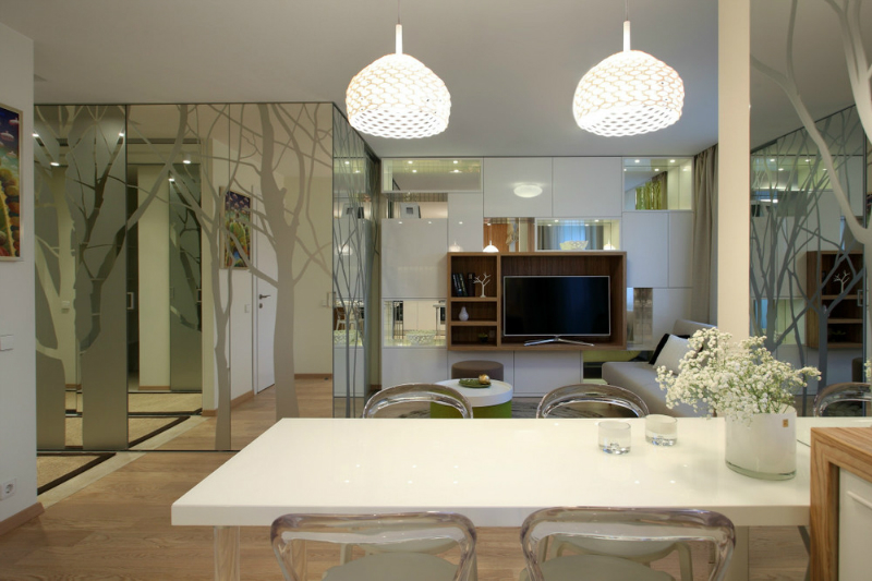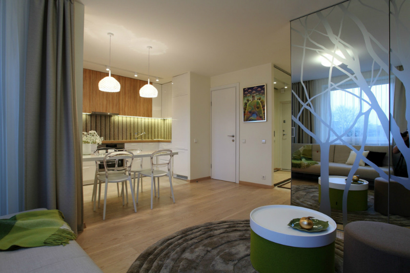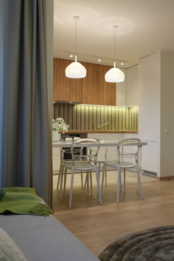 Hoy te quiero mostrar un miniapartamento en el que si hay se puede destacar sin fijarse mucho en los detalles es la funcionalidad a pesar de sus escasos metros. Una vivienda con almacenaje oculto por cada rincón pero sin parecer que todo esta metido en una caja agolpado. Se respeta cada centímetro, distancia donde no caben agobios y puedes estar relajado en cada espacio ya que se marca cuales son las diferentes zonas. Grandes ideas, como la pared de cristal con un vinilo que atrae a la naturaleza y a la vez consigue luz dentro del dormitorio pero intimidad con el resto de la casa, detalle que es una gran idea en cuanto a los espacio pequeños. Todo es un espacio abierto pero la sensación de comodidad tan importante que es en un hogar, este miniapartamento lo cumple 100%.